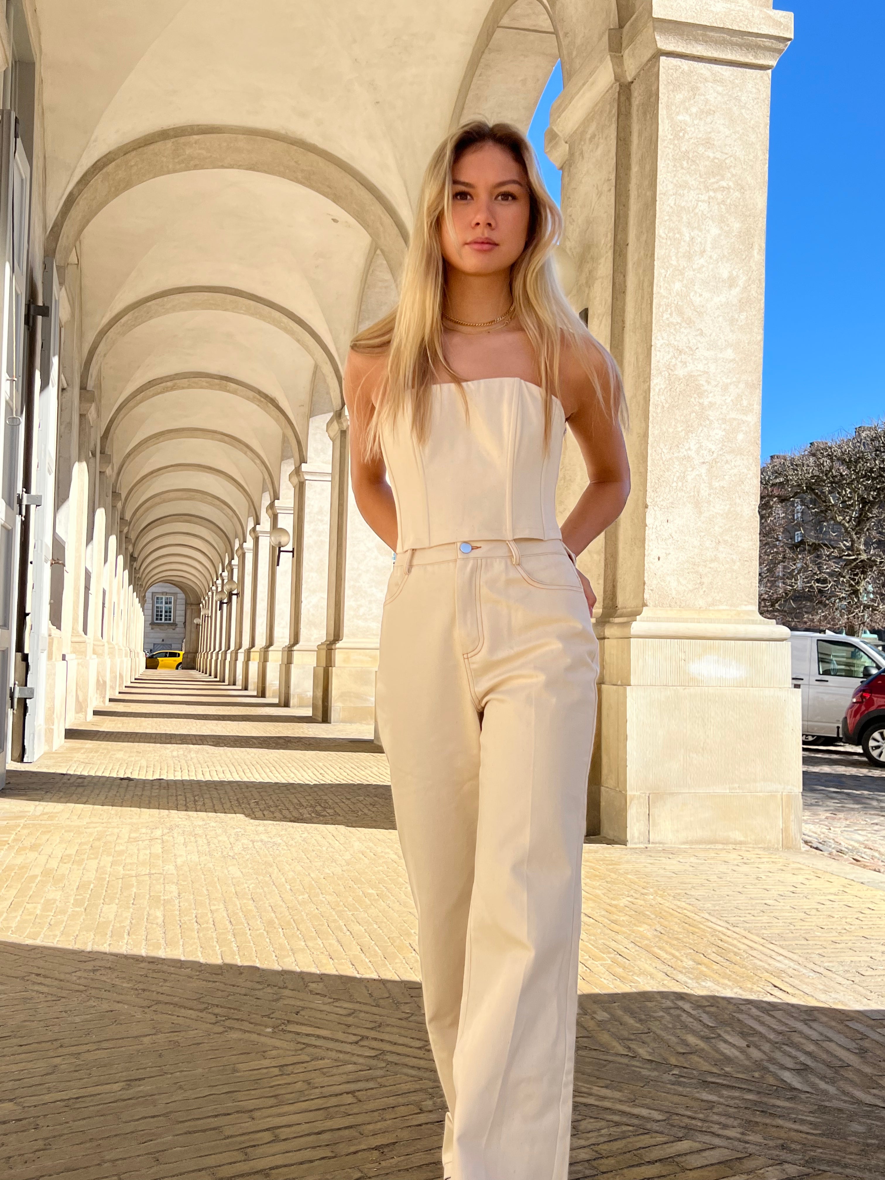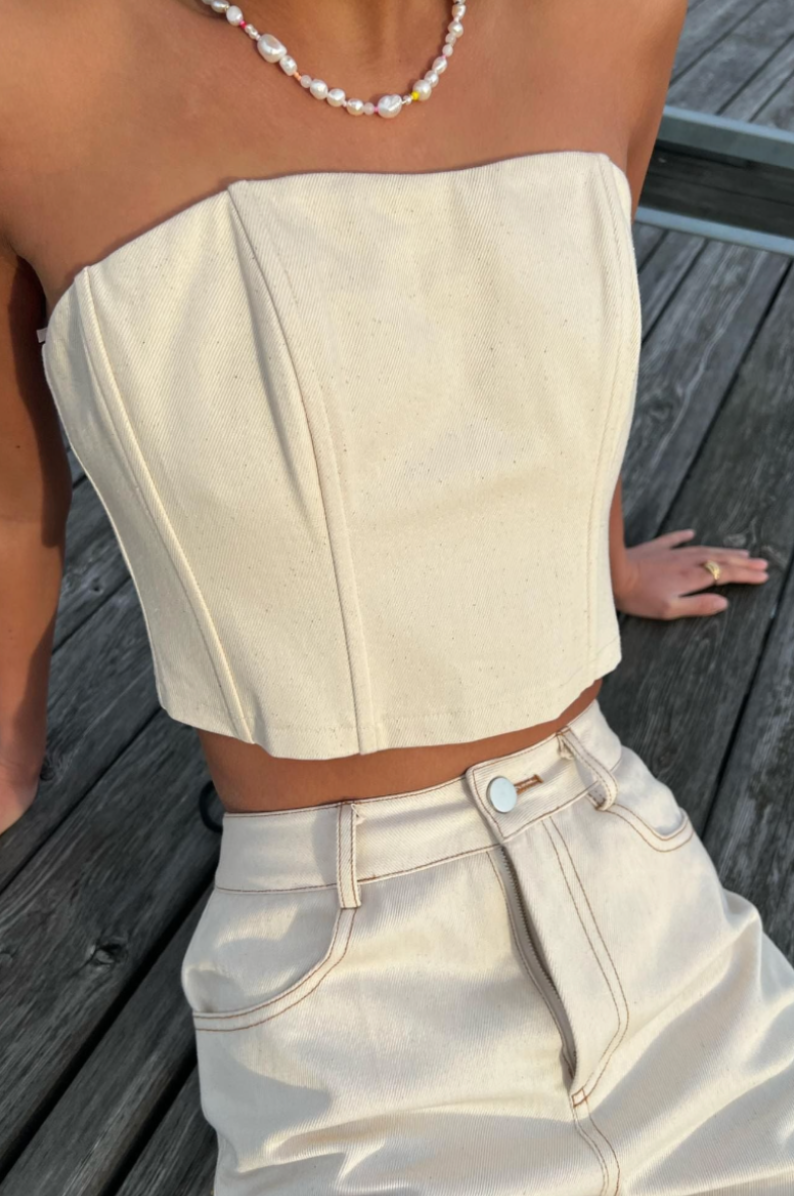 Toppen er stor i størrelsen, derfor anbefaler vi at man tager en størrelse mindre, hvis man ønsker at den skal sidde helt tæt. Toppen er i denim så den vil udvide sig en smule.