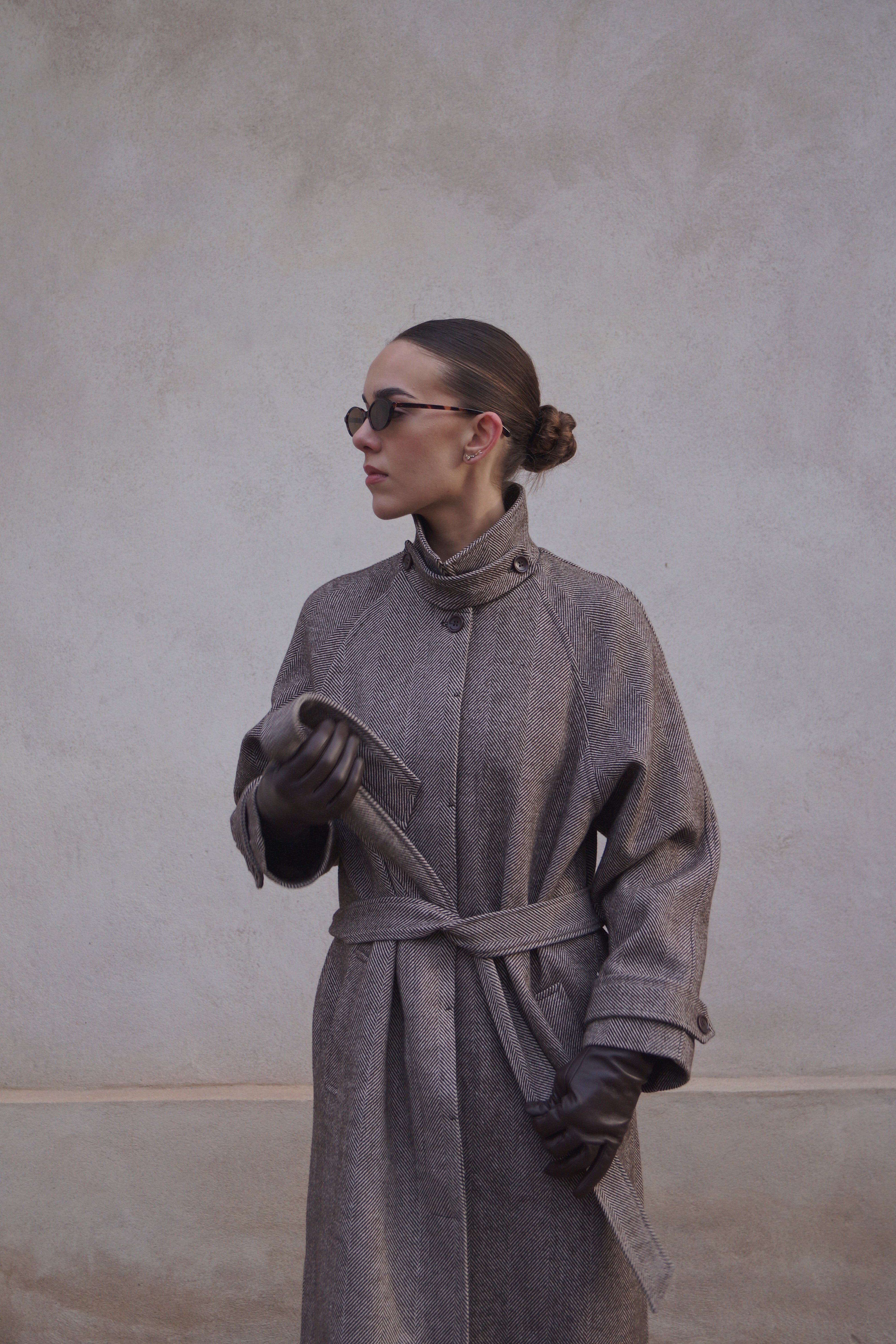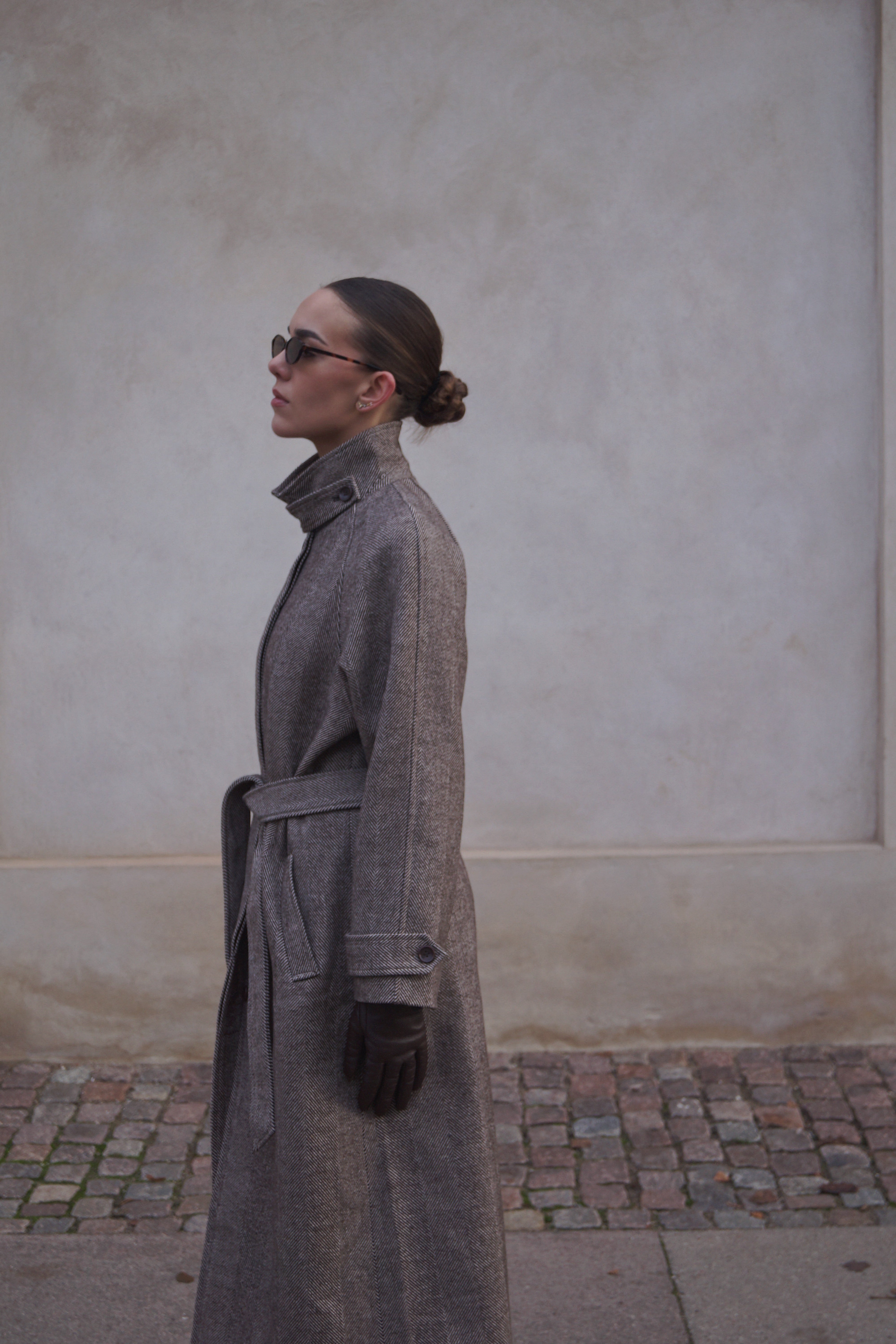 Opdag vores elegante lange frakke til kvinder, designet med en moderne høj krave, der kan lukkes for ekstra varme og et stilrent look. Frakken er fremstillet i et smukt vævet materiale med struktureret mønster, som giver et eksklusivt og unikt udtryk. Med bindebånd i taljen kan du skabe en flatterende silhuet, mens de praktiske sidelommer gør frakken ideel til både hverdag og mere elegante anledninger.