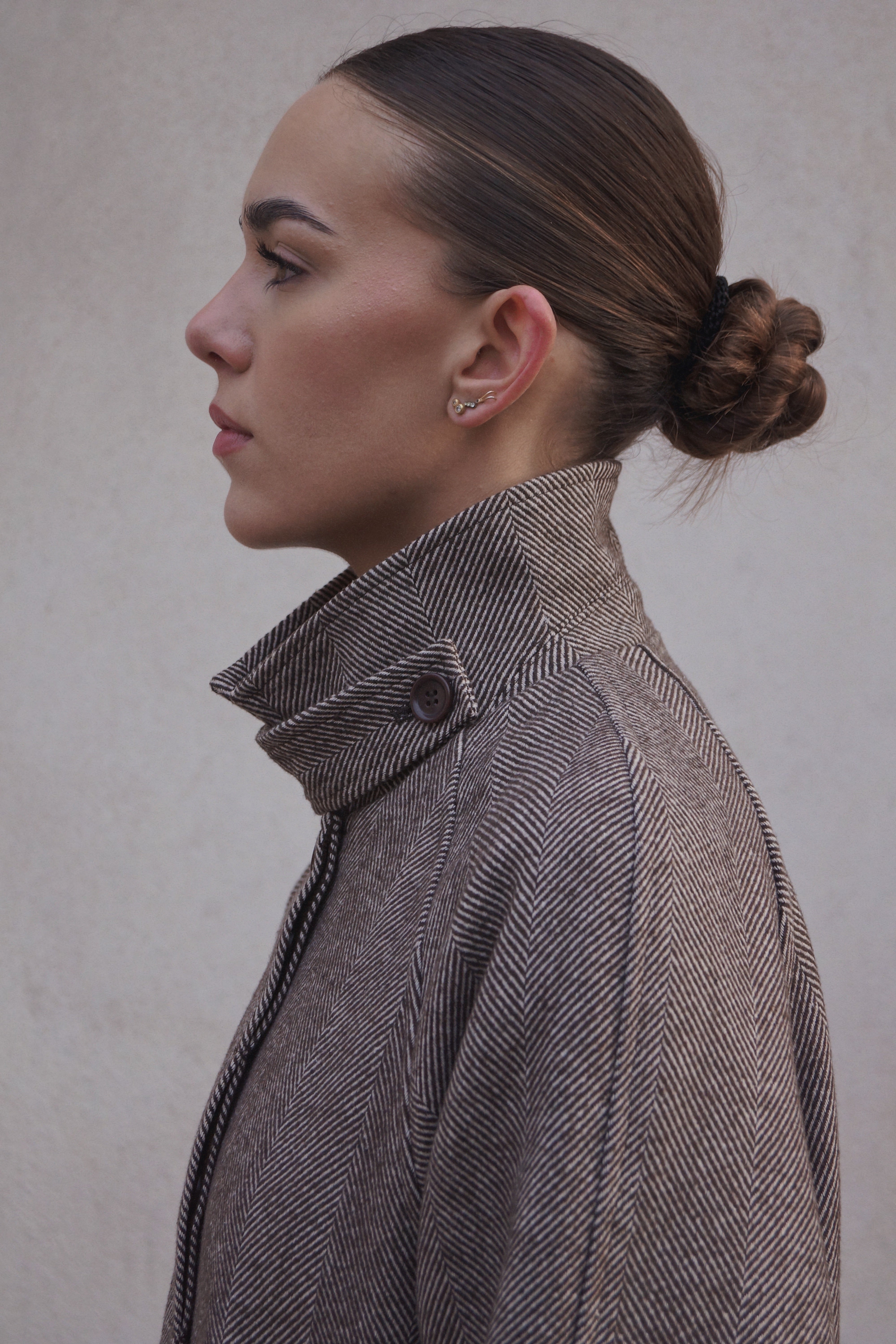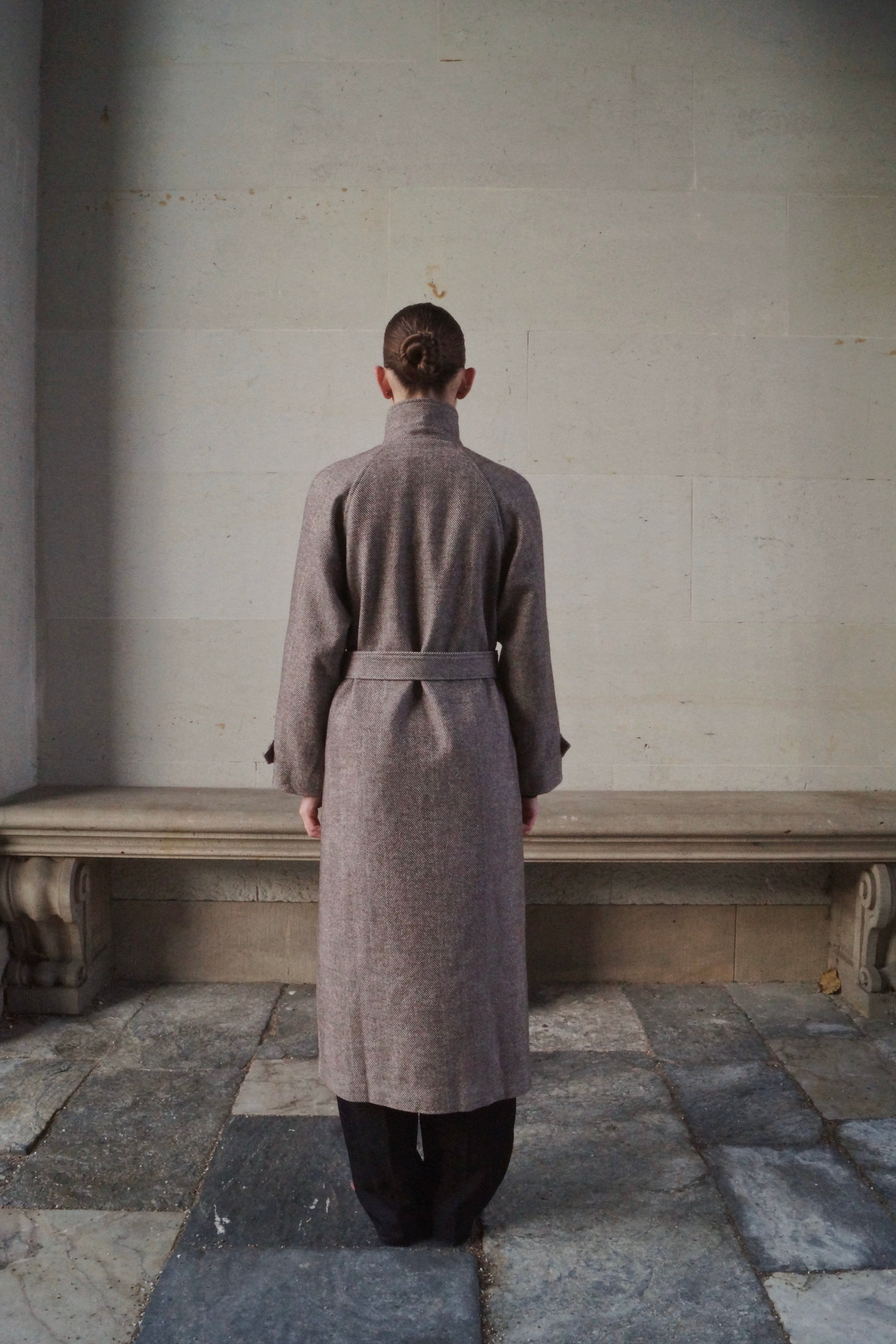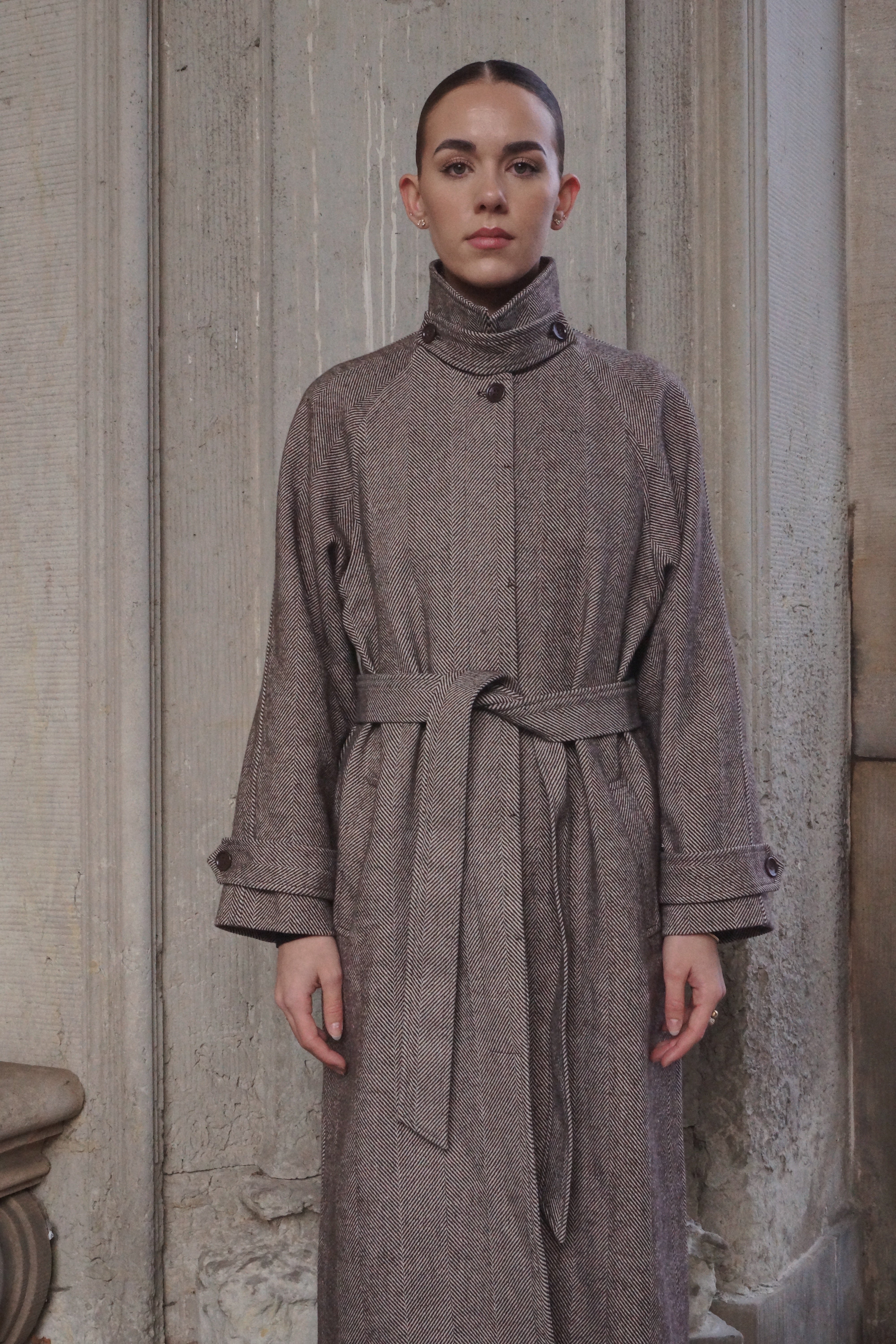 Lang jakke med høj krave og bindebånd - Brun/beige