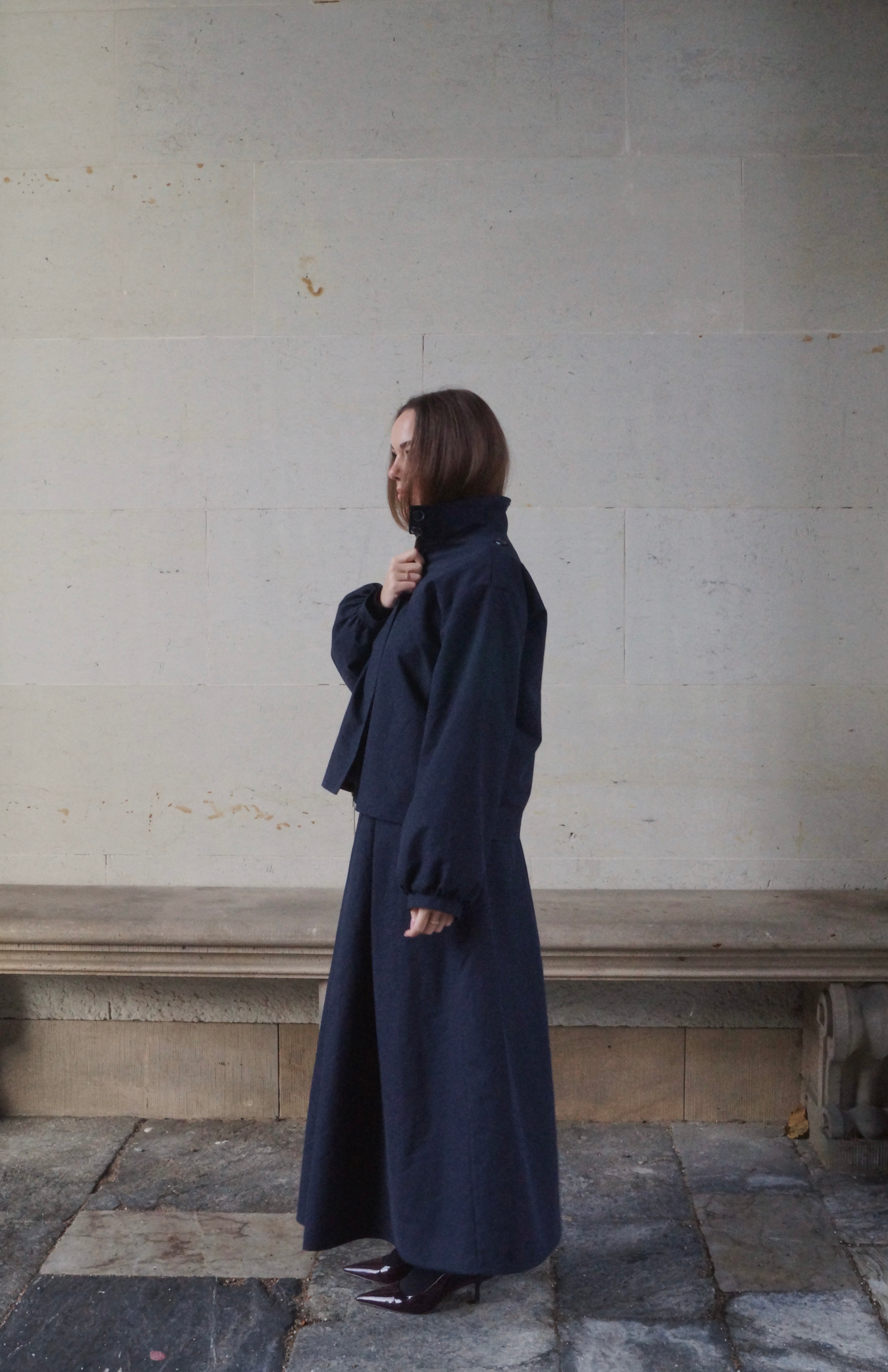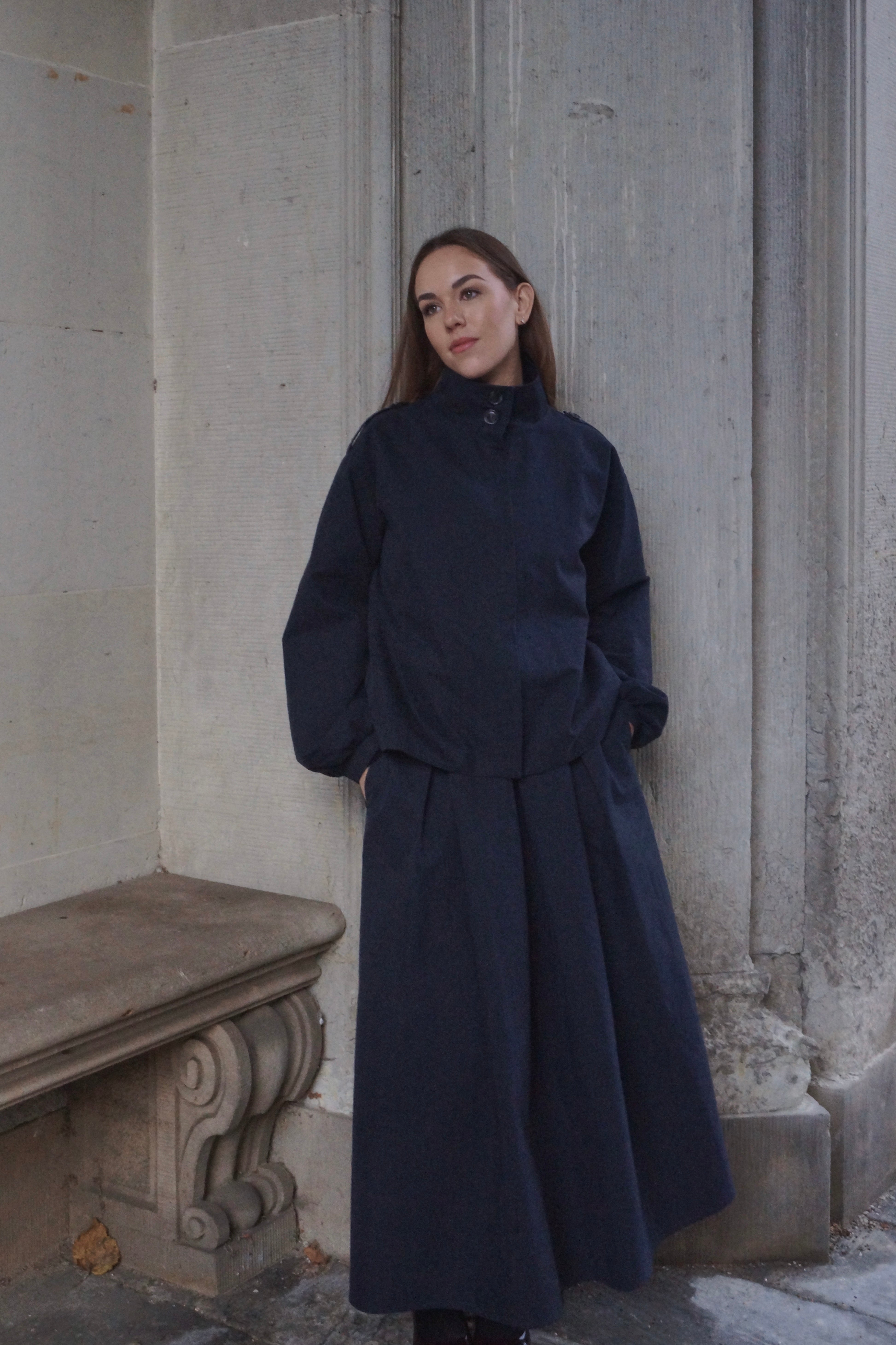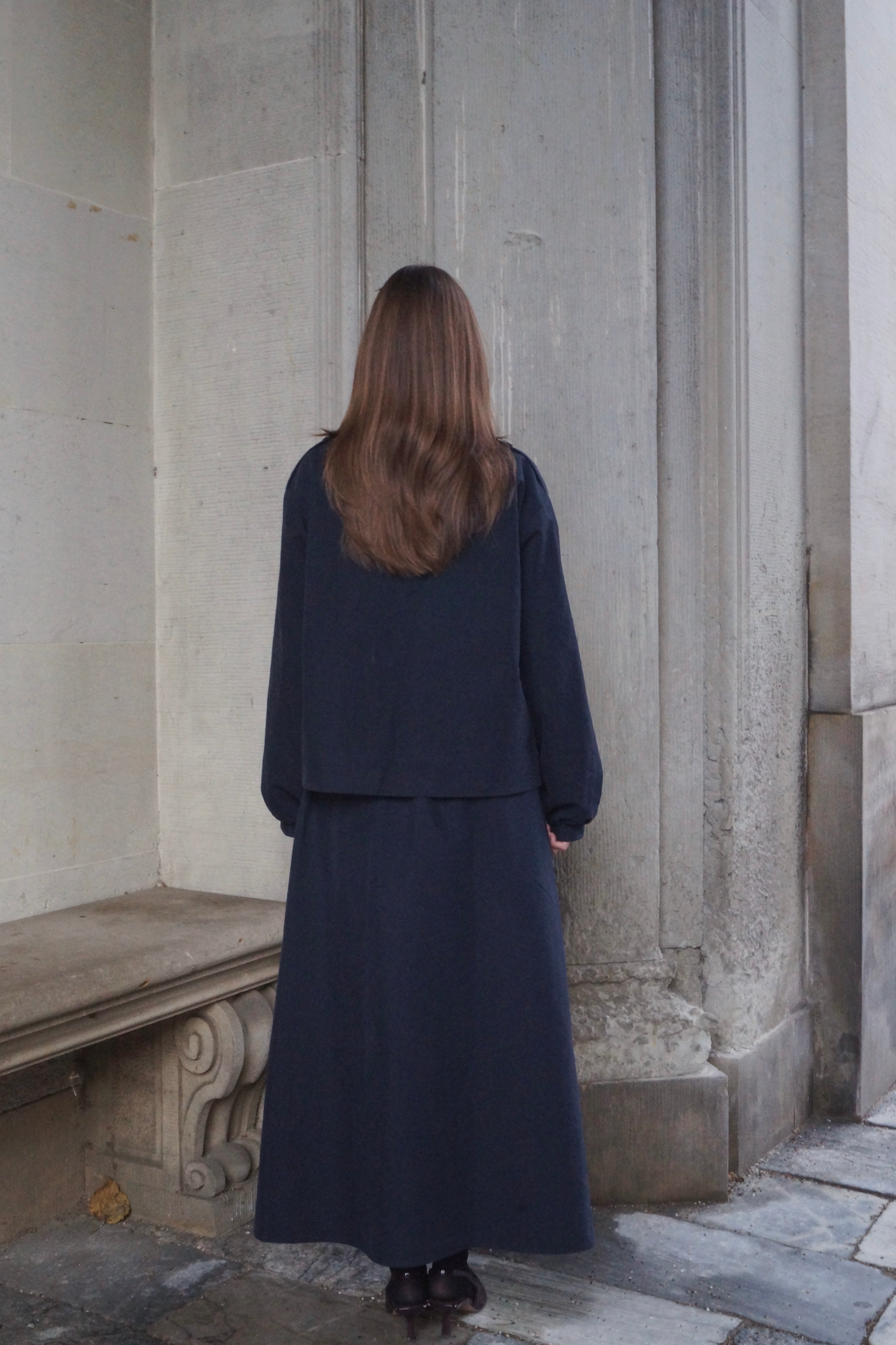Opgrader din garderobe med vores lange, volume maxi-nederdel i navy, perfekt til moderne damemode. Nederdelen har en elegant trekantet A-silhuet, der skaber smuk bevægelse og et feminint, tidløst udtryk. Den klassiske navyfarve gør den nem at style til både hverdagslooks og mere sofistikerede outfits.