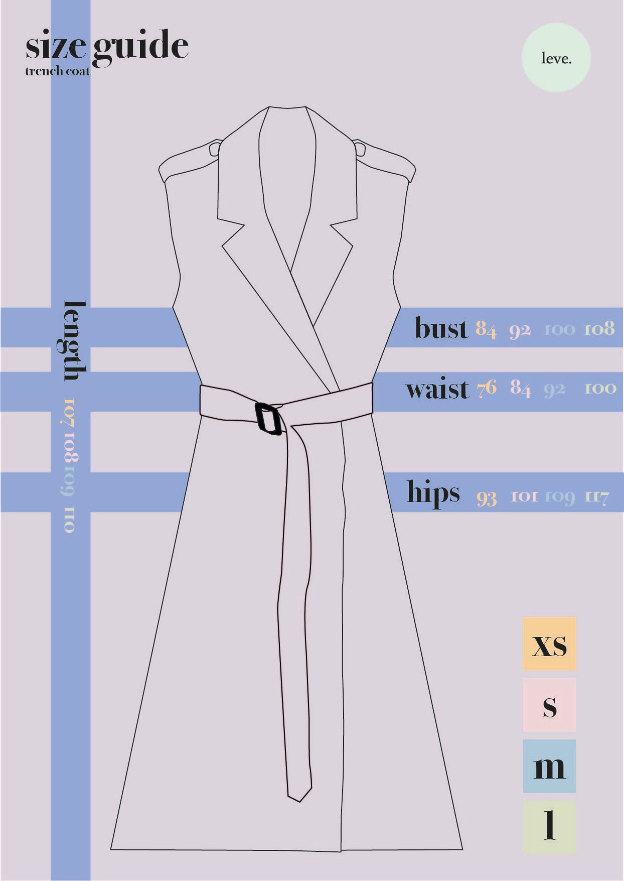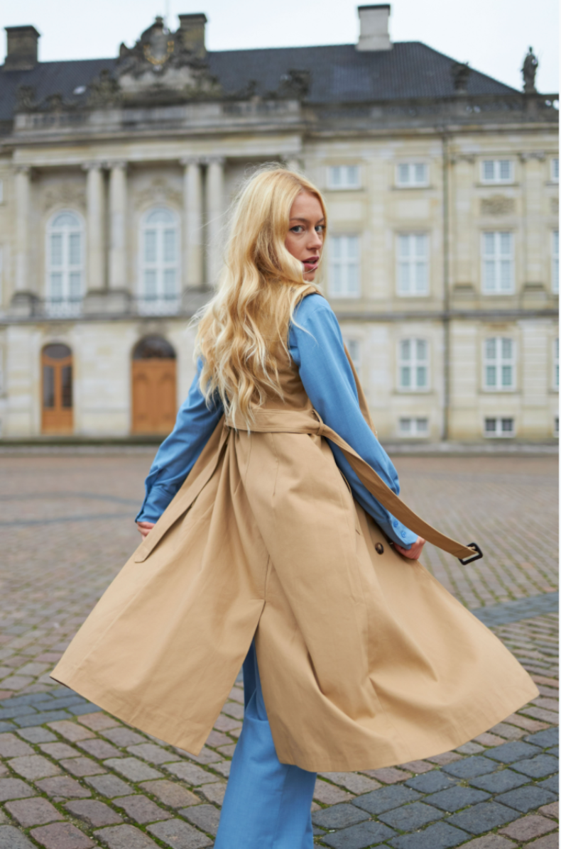 Vores ærmeløse, knælange trenchcoat kommer med et bælte ved taljen som er med til at give figur. Man kan bruge den på en række måder, lukket m. bælte til helt åben.